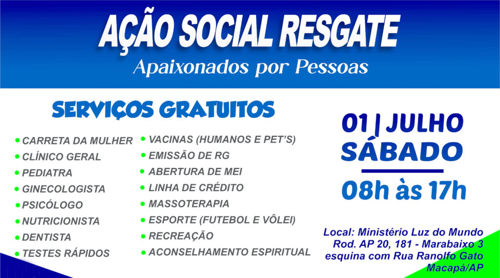 O Ministério Luz do Mundo realizará neste sábado, 01 de julho, das 8h às 17h, a primeira grande ação social “Resgate”, com a oferta de mais de 15 serviços para a comunidade. A ação vai acontecer na sede da Igreja, na Rodovia AP 20, número 181, bairro Marabaixo III.