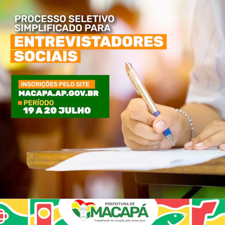 A remuneração para o cargo de entrevistador social é de R$ 1.333,92, com 40 horas semanais. As inscrições acontecem no período de 19 a 20 de julho via internet exclusivamente pelo site da Prefeitura de Macapá com preenchimento e encaminhamento de formulário disponível no link do edital.