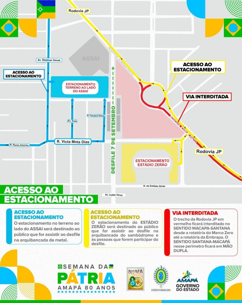 A partir das 9h desta quinta-feira, 7, serão realizadas as interdições necessárias para o desfile. A Rodovia Josmar Pinto (antiga JK), no sentido Santana-Macapá, no perímetro da rotatória da Embrapa até a rotatória do monumento Marco Zero do Equador, ficará em mão dupla. Os veículos ao chegarem na rotatória serão desviados para avenida David Nunes de Lima, na área conhecida como Seringal, para terem acesso à avenida Equatorial.
