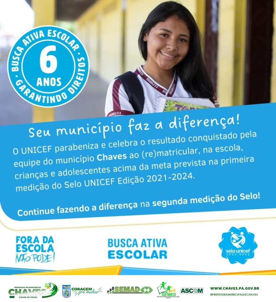 Com ações efetivas, a Prefeitura de Chaves por meio da Secretaria Municipal da Educação, com a implementação da Busca Ativa Escolar (BAE), um dos resultados sistêmicos de educação no Selo UNICEF 2021-2024, conseguiu superar a meta e atingir mais de 100% dos critérios estabelecidos pelo Busca Ativa Escolar.