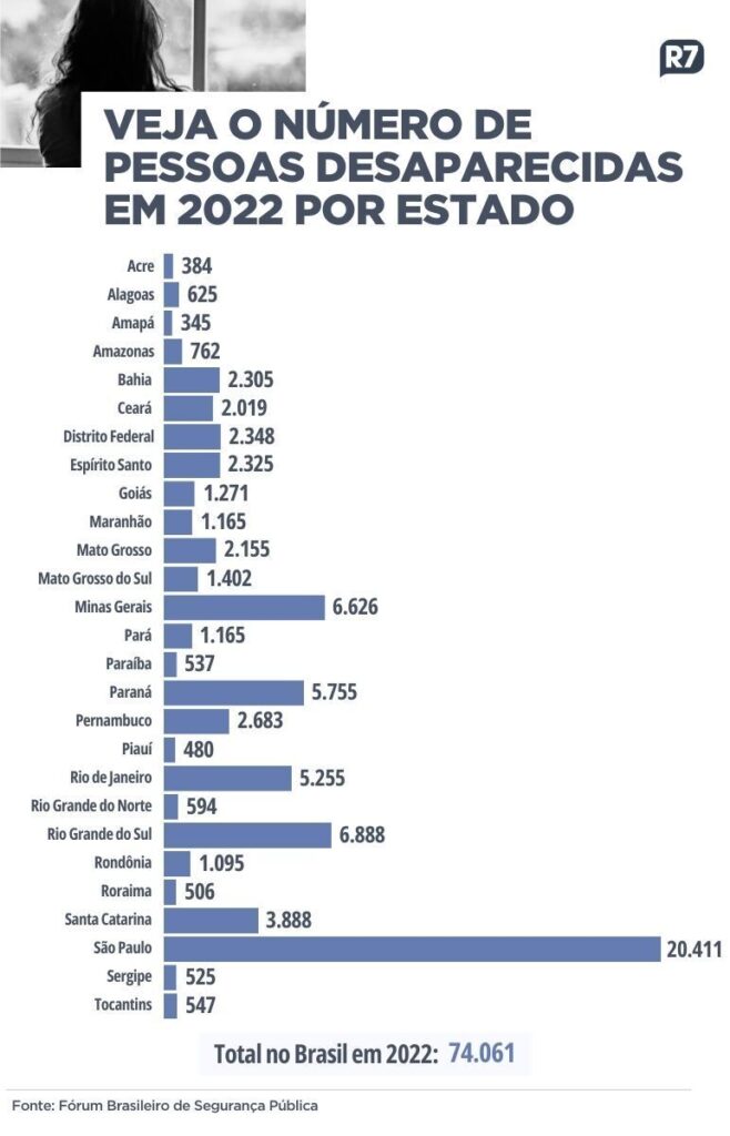 No ano passado, o Brasil registrou 74.061 desaparecimentos, ou seja: 203 pessoas sumiram em média por dia, conforme os dados recentes do FBSP (Fórum Brasileiro de Segurança Pública).
