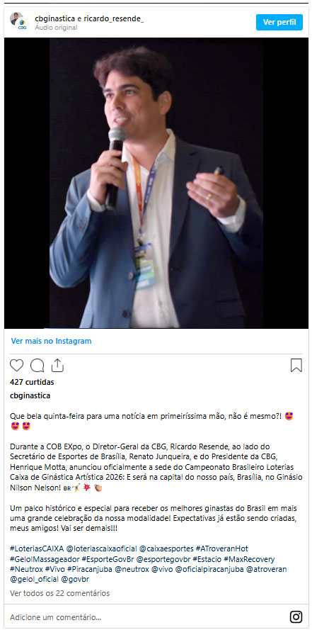 O diretor-geral da Confederação Brasileira de Ginástica (CBG), Ricardo Resende, anunciou que Brasília será sede o Campeonato Brasileiro de Ginástica Artística, em agosto de 2026. A competição faz parte da preparação brasileira para o Mundial de Roterdã, nos Países Baixos, também no próximo ano, valendo vaga para os Jogos Olímpicos de Los Angeles 2028.