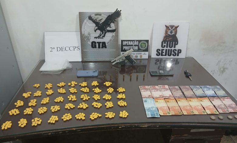 Durante a revista no veículo, foram encontrados 426 comprimidos de ecstasy, R$ 270 em dinheiro, dois celulares e a arma de fogo utilizada no confronto.