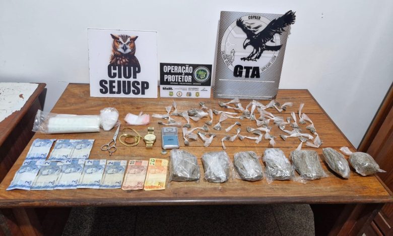 Dentro da sacola, havia 7 porções grandes e 49 pequenas de maconha, R$ 47 em espécie, uma balança de precisão, um relógio dourado Seculus, um cordão dourado, uma tesoura prateada, um celular Samsung vermelho e sacos plásticos usados para embalar drogas.
