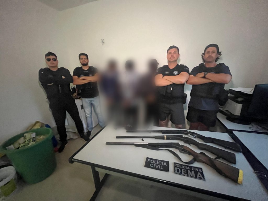 De acordo com informações da Delegacia Especializada em Crimes Contra o Meio Ambiente (Dema), três homens foram abordados pela equipe enquanto trafegavam em motos. Com eles, os policiais encontraram três espingardas calibre 12 e munições.
