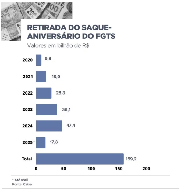 Entre 2020 e 2025, as operações de empréstimo com o saque-aniversário do FGTS somaram R$ 236 bilhões. Atualmente, o fundo conta com 42 milhões de trabalhadores ativos, dos quais 21,5 milhões (51%) aderiram ao saque-aniversário. Desses, cerca de 70% realizaram operações de antecipação do saldo junto às instituições financeiras.