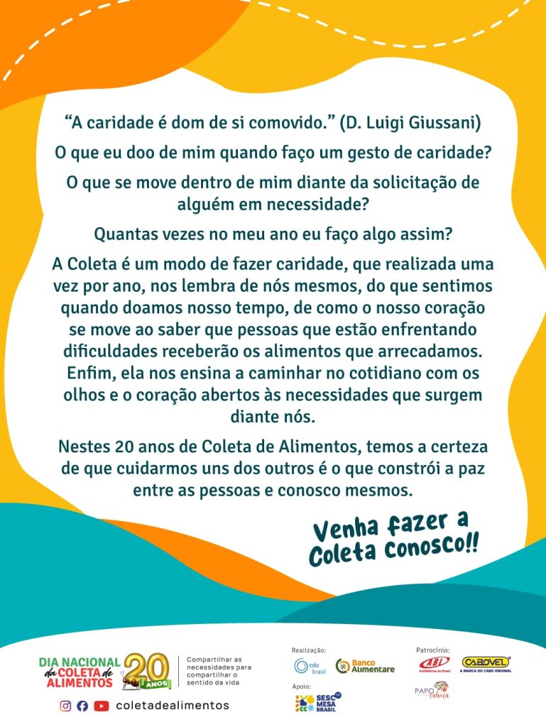 A Companhia das Obras (CdO), organização de origem italiana, estabelecida no Brasil em 1999, anuncia a realização da Coleta Nacional de Alimentos e reforça o convite à toda comunidade para a formação de parcerias estratégicas, por meio de gestos de solidariedade. O data oficial está marcada para este sábado (8), em âmbito nacional.