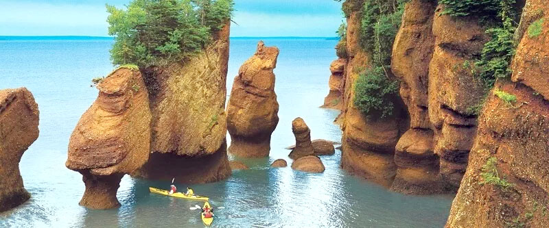 Em maré baixa, determinadas áreas da costa se transformam completamente. Em trechos como Hopewell Rocks, formações rochosas esculpidas pela erosão surgem por inteiro, revelando pilares altos e estreitos, coroas de vegetação na parte superior e bases marcadas por séculos de impacto das ondas. Os visitantes podem literalmente caminhar pelo fundo da baía, pisando onde, poucas horas antes, barcos flutuavam.