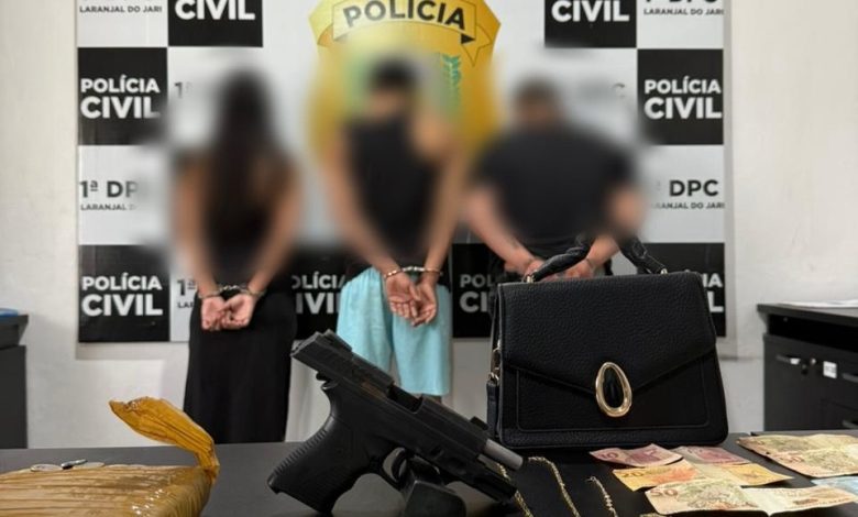 Dois homens e uma mulher foram presos em Laranjal do Jari, após serem flagrados em condutas que indicavam possível prática de roubo e envolvimento com o tráfico de drogas, além de porte ilegal de arma de fogo. A ação foi realizada pelas equipes da Polícia Civil com apoio da Polícia Penal.