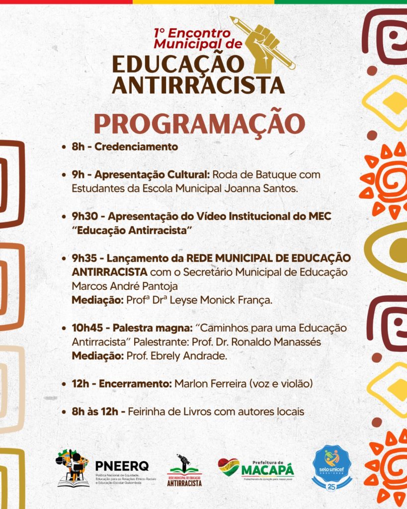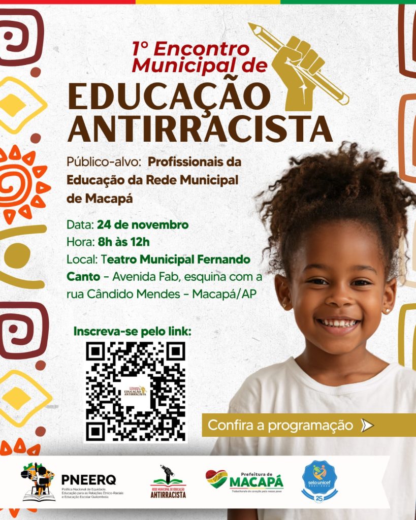 A Prefeitura de Macapá promove, na manhã da próxima segunda-feira (24), o lançamento da Rede Municipal de Educação Antirracista, como parte da programação do 1º Encontro Municipal de Educação Antirracista.