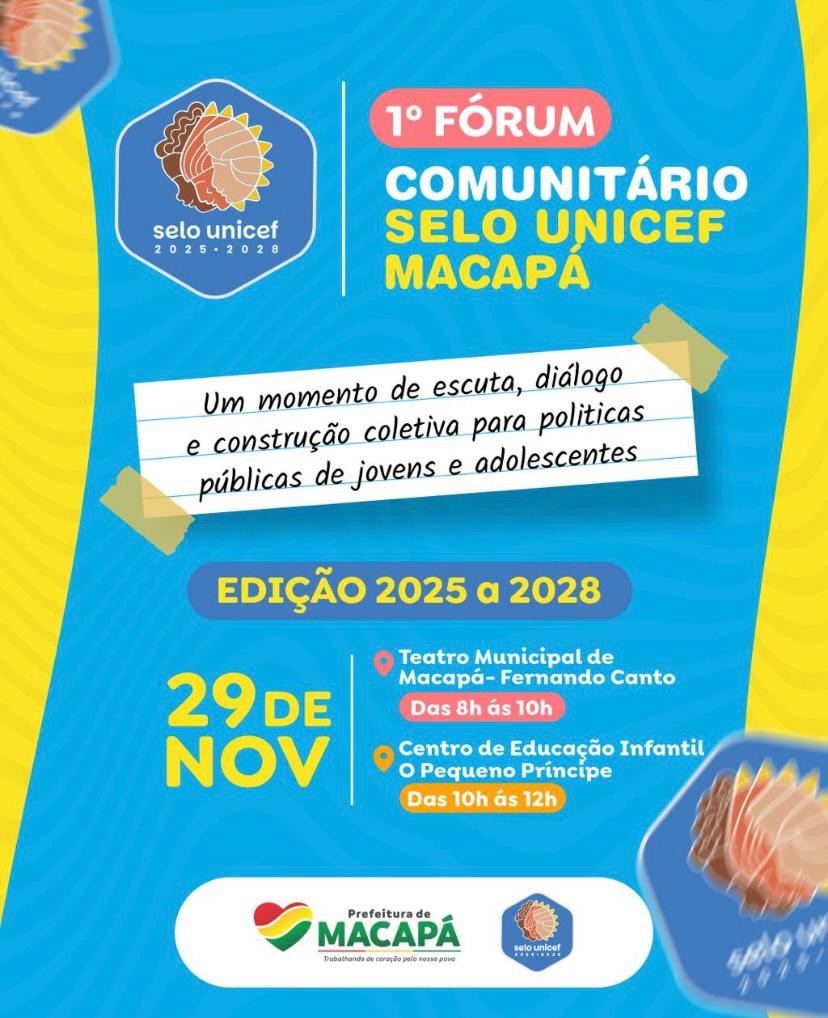 A Prefeitura de Macapá realiza neste sábado (29), o 1º Fórum Comunitário do Selo UNICEF – Edição 2025–2028, uma iniciativa intersetorial que envolve as Secretarias Municipais de Saúde, Educação, Assistência Social e o Conselho Municipal dos Direitos da Criança e do Adolescente (CMDCA). O evento ocorrerá em dois momentos: das 8h às 10h, no Teatro Municipal Fernando Canto, e das 10h às 12h, no Centro de Educação Infantil O Pequeno Príncipe, ambos no centro da capital.