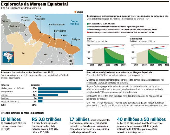 Faria lembra que por enquanto não há garantias de que há petróleo na margem. Há apenas análises preliminares. Em outubro, a Petrobras recebeu licença do Ibama para a perfuração de poço exploratório em águas profundas do Amapá, na foz do Amazonas, uma das cinco bacias que compõem a Margem Equatorial.