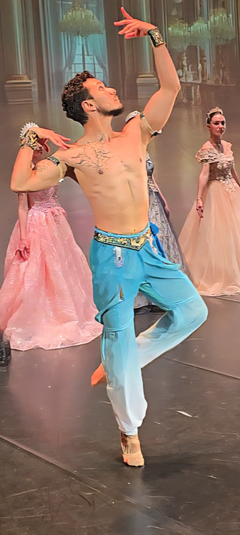 No espetáculo, Pablo assume os principais papéis masculinos da montagem e apresenta duas variações emblemáticas do balé clássico internacional, como “O Corsário” e “O Príncipe Désiré”, evidenciando domínio técnico, potência interpretativa e presença cênica.