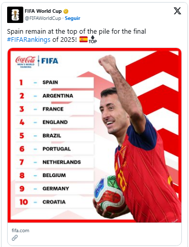 Espanha é líder, Argentina é vice e França aparece em terceiro