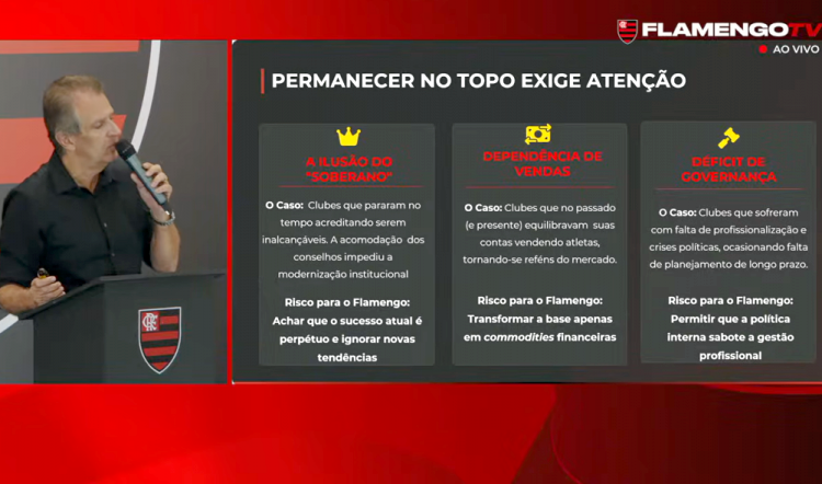 Ao mostrar o que o Mengão precisa fazer para continuar no topo, usou como exemplos “a ilusão do soberano” – uma clara referência ao São Paulo – e “déficit de governança”, entendido como crítica ao Corinthians. “O cara é campeão de tudo, ganha o estádio, não paga e dez anos depois está quebrado”.
