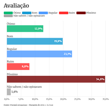 O levantamento revela, ainda – que, para apenas 12,9% – a administração é considerada ótima, e para 19,8%, boa. Para 34,8%, é considerada péssima, e 8,0% a consideram ruim. Os que avaliam o governo como regular somam 23,1%, e 1,4% não sabe ou não opinou.