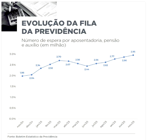 O volume passou de 1,98 milhão, no mesmo período de 2024, para 2,97 milhões de requerimentos aguardando aposentadoria, pensão ou auxílio. O que representa um aumento de 49%.
