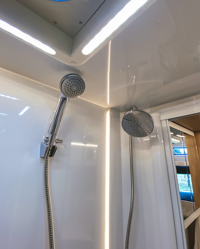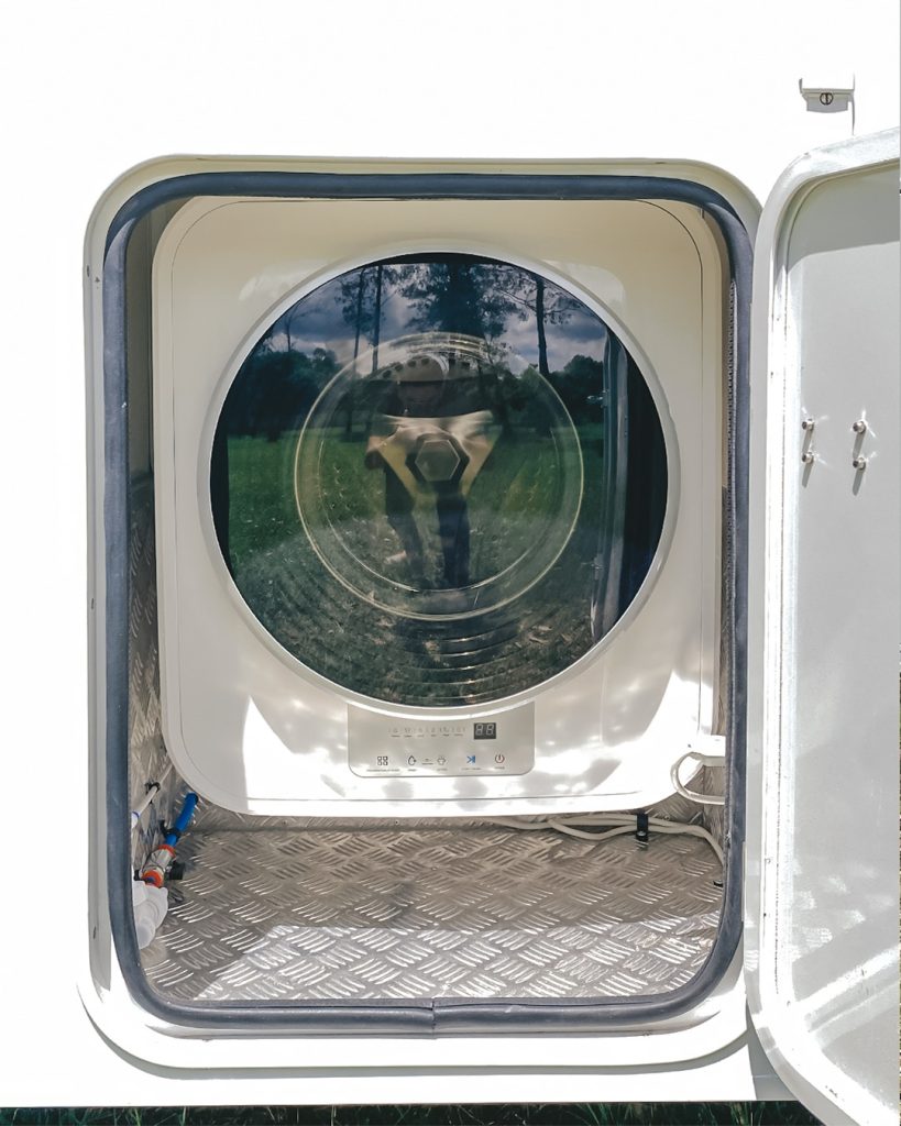 Sob o toldo, o veículo oferece uma lava e seca importada de 3 kg, permitindo lavagem de roupas no exterior, protegida do sol ou da chuva, ampliando autonomia em viagens longas.