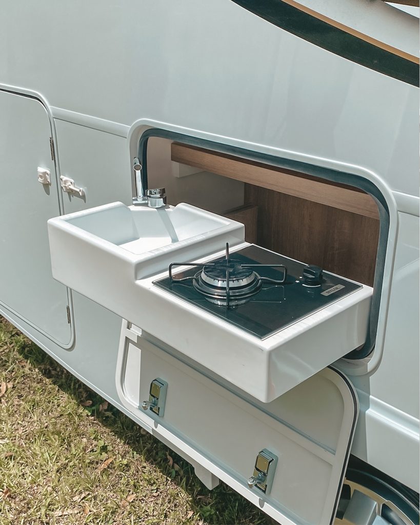Na lateral externa, o motorhome dispõe de cozinha externa com fogão de um queimador, lavatório, iluminação e tomada, possibilitando preparo de alimentos fora do veículo com conforto e praticidade.