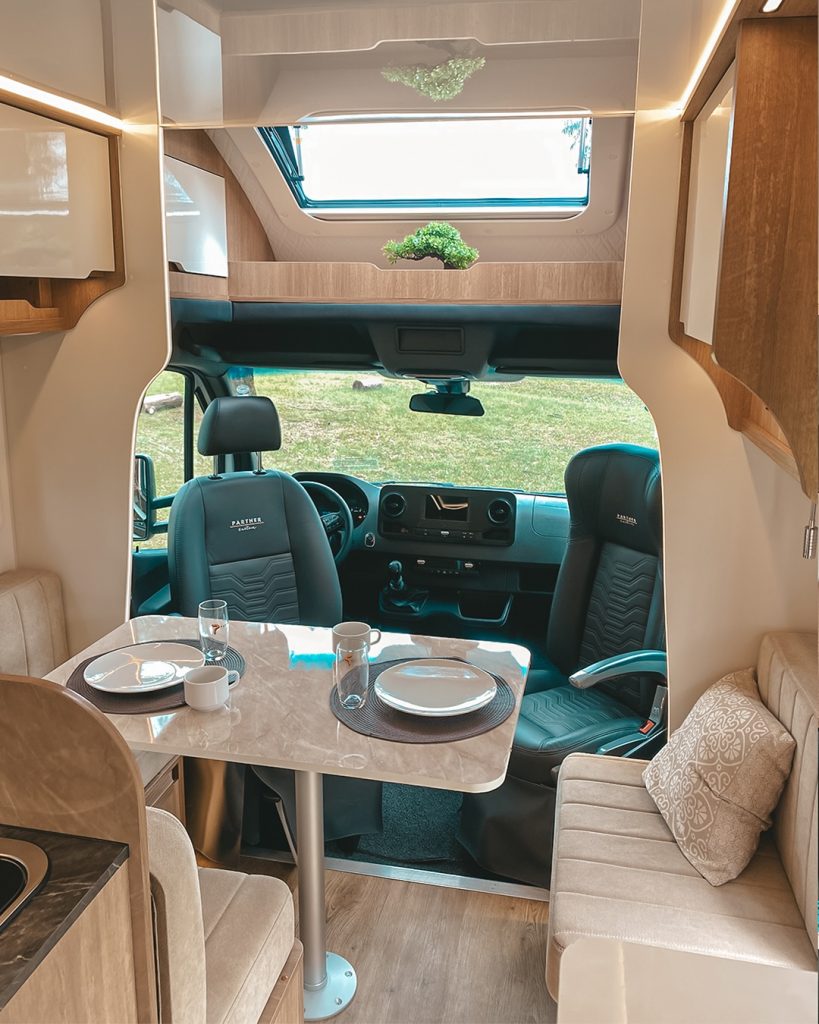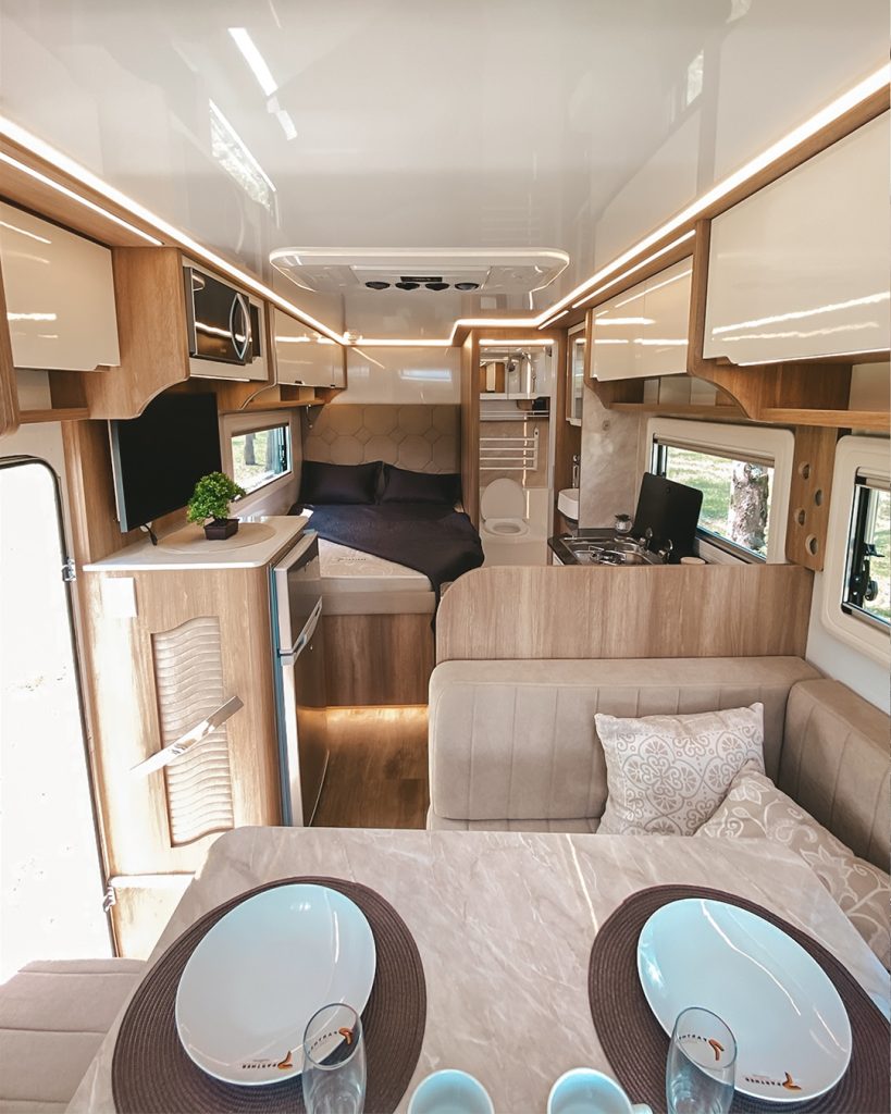 Internamente, o Position 6.5 surpreende pelo layout europeu, com sala capaz de acomodar cinco pessoas confortavelmente, mantendo corredor lateral livre e circulação fluida ao longo do veículo.