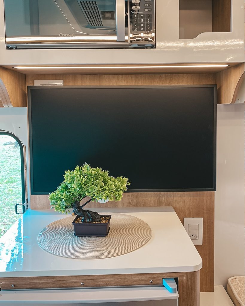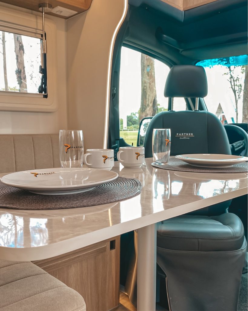 A mesa giratória pode ser reposicionada ou removida durante a viagem, ficando guardada atrás do sofá, sem interferir na locomoção ou no uso cotidiano do espaço interno.