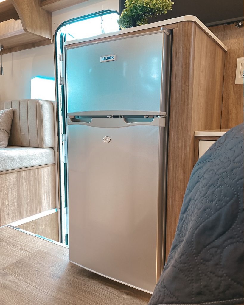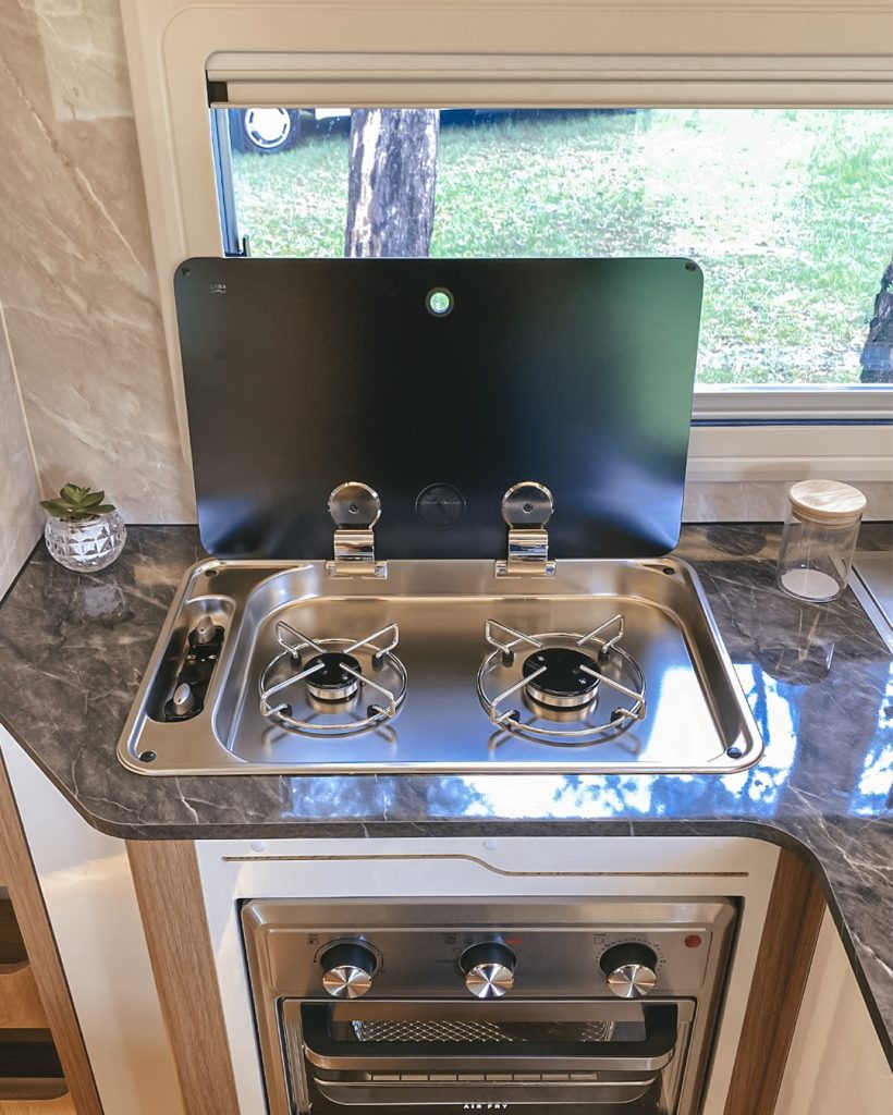 O conjunto inclui forno com air fryer e ventilação externa, micro-ondas de 20 litros e geladeira duplex 12 V com trava para deslocamentos, ampliando autonomia culinária.