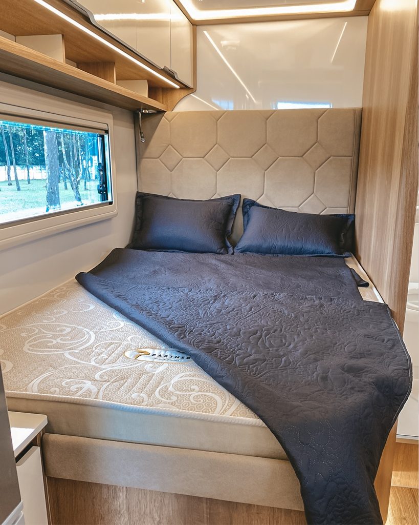 Mesmo com a alcova, o veículo mantém altura final inferior a três metros, já totalmente pronto, fator relevante para acessos urbanos, estacionamentos e deslocamentos em áreas com restrições de gabarito.