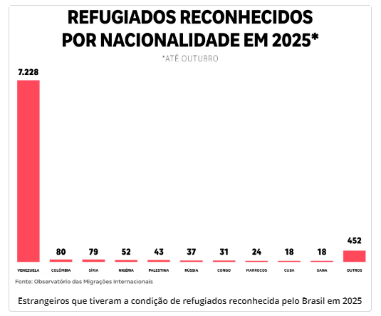 Além disso, os venezuelanos lideraram a quantidade de migrantes reconhecidos com a condição de refugiados: 7.228 dos 7.882 pedidos atendidos pelo governo brasileiro até outubro de 2025 foram de cidadãos da Venezuela.