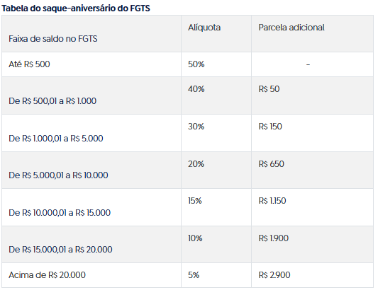 O valor depende do saldo total nas contas do FGTS e segue uma tabela progressiva. A alíquota varia de 5% a 50%, com uma parcela adicional fixa.