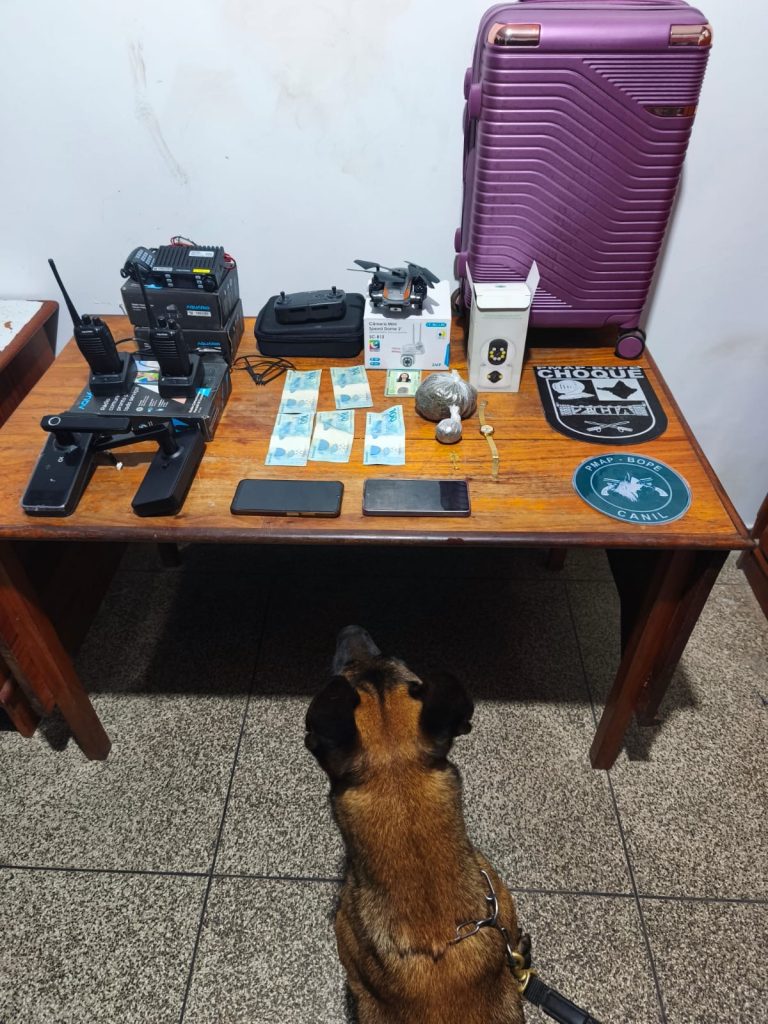 No imóvel, com o apoio de um cão farejador, os policiais encontraram drogas escondidas dentro de uma mala, além de equipamentos utilizados para a comunicação entre traficantes e para o monitoramento da movimentação policial, como câmeras, drone e rádios transmissores.