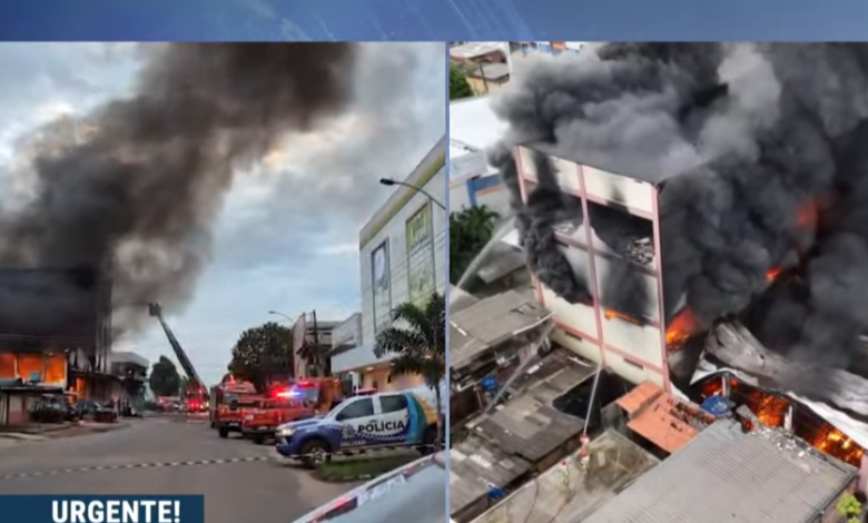 Um incêndio de grandes proporções atingiu um estabelecimento comercial na Av. Felipe Camarão, entre as ruas Santos Dumont e Barão de Mauá, bairro do Buritizal, zona sul de Macapá.