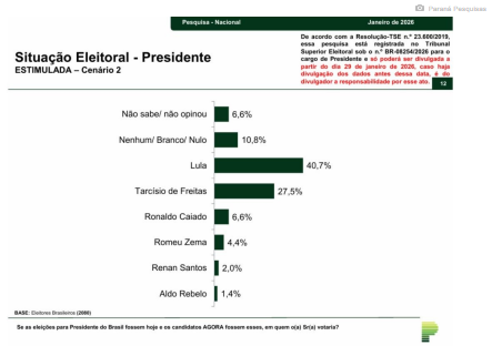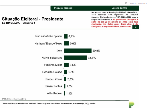 O novo levantamento nacional do Instituto Paraná Pesquisas, divulgado nesta quinta-feira (29/1), aponta o presidente Luiz Inácio Lula da Silva (PT) na liderança das intenções de voto no primeiro turno das eleições de 2026 e cenários de empate técnico em eventuais disputas de segundo turno.