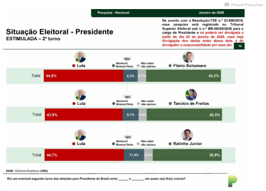 No cenário entre Lula e Ratinho Junior, o presidente registra 44,7%, contra 38,9% do governador do Paraná. Outros 16,4% não escolheram nenhum dos dois ou não opinaram.