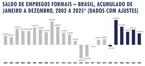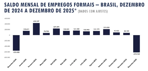 O Brasil registrou o fechamento de 618.164 postos de emprego em dezembro, apontam dados divulgados pelo Ministério do Trabalho e Emprego (MTE). Ainda assim, no número consolidado de 2025, foram criadas 1.279.498 vagas, resultado de 26.599.777 admissões e 25.320.279 desligamentos.