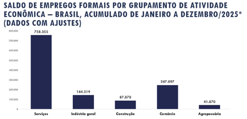 Todos os cinco agrupamentos econômicos observados pelo MTE registraram saldo positivo no acumulado do ano, com destaque absoluto para o setor de serviços, responsável por mais da metade dos postos criados no ano (758.355 vagas).