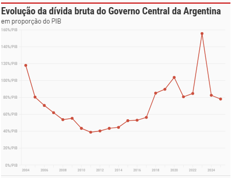 De um pico de 155,7% em proporção de PIB (Produto Interno Bruto) no ano de 2023, a dívida argentina encerrou 2024 em 82,6%, foi a uma mínima de 76,4% no segundo trimestre de 2025 e encerrou o terceiro trimestre do ano passado em 78,2%.