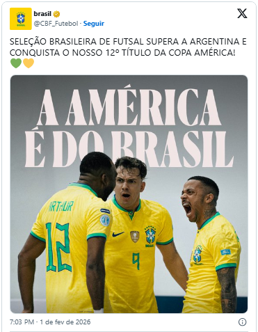 Brasil bate Argentina e conquista 12º título na Copa América de Futsal