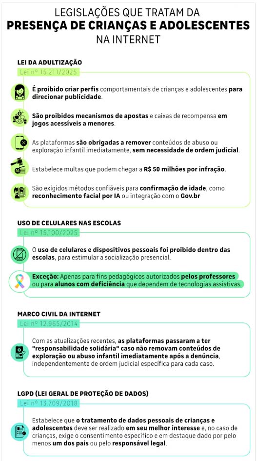 No Brasil, o debate também ganha corpo. Entre 2024 e 2025, diversas normas sobre a presença digital de crianças e adolescentes foram sancionadas, elevando o tema à pauta pública.