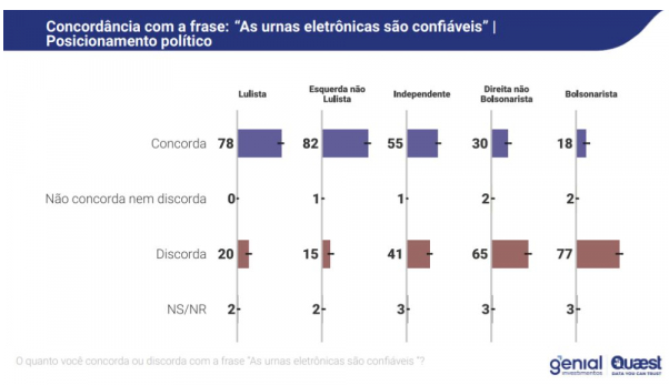 Dos que acreditam na eficiência das urnas, 78% se declararam apoiadores de Lula e 18% são eleitores do ex-presidente Jair Bolsonaro