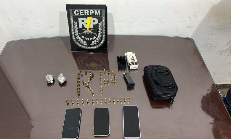 Durante as buscas, os militares encontraram munições espalhadas pelo perímetro do imóvel. Dentro de uma bolsa havia 43 munições, seis de calibre 9mm e 37 de calibre .380, além de um carregador de pistola 9mm. Também foram apreendidas duas porções de substância semelhante à maconha e aparelhos celulares.