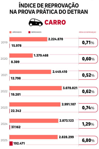 O percentual de reprovados na prova prática do Detran (Departamento de Trânsito) cresceu entre 2019 e o ano passado. Antes, o número de reprovações, em relação ao número de pessoas que realizavam a prova, ficava em menos de 2% tanto no caso da prova tipo A (de moto) como do tipo B (de carro). Em 2025, contudo, o percentual foi de 5,60% para veículos de duas rodas e 6,80% para carros.