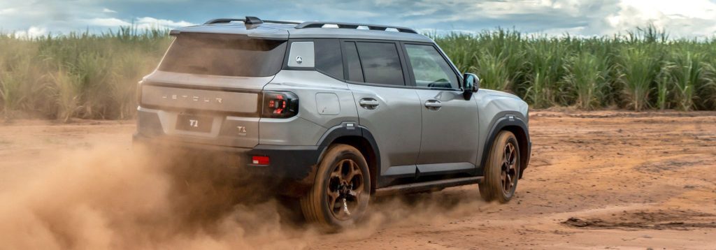 Ainda assim, tem boas capacidades off-road, como ângulo de ataque de 28°, ângulo de saída de 29° e capacidade de travessia de 60 cm, monitorados por sensores e gráficos na tela do carro. A distância livre para o solo é de 19 cm, a suspensão é macia, mas um pouco mais firme do que num SUV mais raiz. Isso deixa o T1 estável e previsível, seja em estradas quebradas ou asfaltadas. Nesses casos, volta e meia aparece alguma vibração não filtrada no volante. Está dentro de uma faixa esperada, pois o T1 não tem o isolamento de um bom SUV europeu.