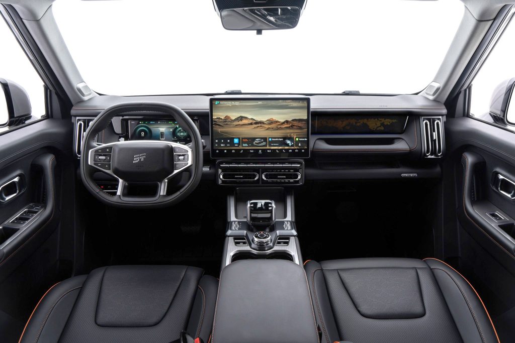 Entre outras funções, a central multimídia traz espelhamento de Apple CarPlay e Android Auto sem fio, câmeras de 540°, sistema de áudio com 9 alto-falantes assinado pela Sony, sistema de controle climático duplo e monitor de profundidade (pode atingir até 60 cm). No console central há um botão para modos de direção e atalhos para funções específicas, como ativação da câmera e um sistema de controle de cruzeiro off-road. Os espaços de armazenamento são práticos, incluindo o espaço sob o seletor de transmissão e o compartimento refrigerado generoso sob o apoio de braço.