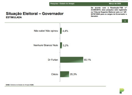 Pesquisa divulgada nesta terça-feira (17) pelo Instituto Paraná Pesquisas aponta vantagem do ex-prefeito de Macapá Dr. Furlan (PSD) na disputa pelo governo do Amapá. No cenário estimulado de primeiro turno, ele aparece com 65,1% das intenções de voto, enquanto o atual governador, Clécio Luís (União Brasil), registra 25,3%.