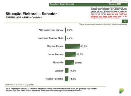 A ex-primeira-dama de Macapá Rayssa Furlan (Podemos) lidera com 63,8% das menções. Em seguida, aparecem o senador Lucas Barreto (PSD), com 46,2%, e o senador Randolfe Rodrigues (PT), líder do governo no Congresso, com 39%.
