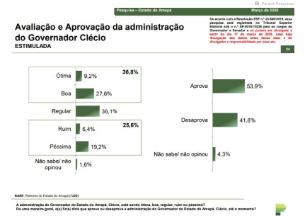 Quando questionados sobre a aprovação da administração estadual, 53,9% afirmaram aprovar o governo de Clécio Luís, enquanto 41,8% disseram desaprovar. Outros 4,3% não souberam ou não responderam.