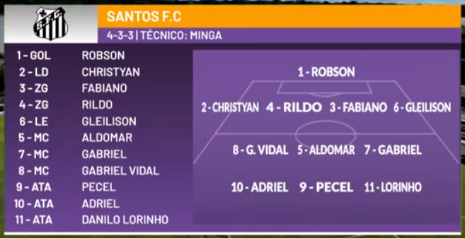 24′: Gol do Santos: Após lançamento, Pecel (9) entra na área e chuta na saída do goleiro Rômulo. Placar Santos 1 X 1 Oratório