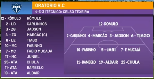 8′: Bambelo (11 – Oratório) chuta para o gol, mas a bola sobe pelo alto sem perigo.