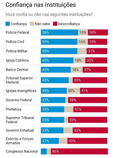 Entre os índices de desconfiança, a pesquisa revela que o Congresso Nacional aparece com o pior resultado, com apenas 9% dos pesquisados dizendo que confiam no Parlamento.