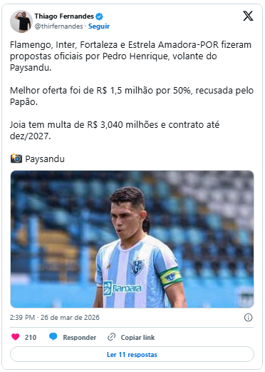 O Paysandu recebeu investidas importantes pelo volante Pedro Henrique, mas decidiu não negociar o jogador neste momento. Clubes como Flamengo, Internacional, Fortaleza e o Estrela da Amadora apresentaram propostas oficiais pelo atleta. A informação foi divulgada pelo jornalista Thiago Fernandes, da Band Minas.